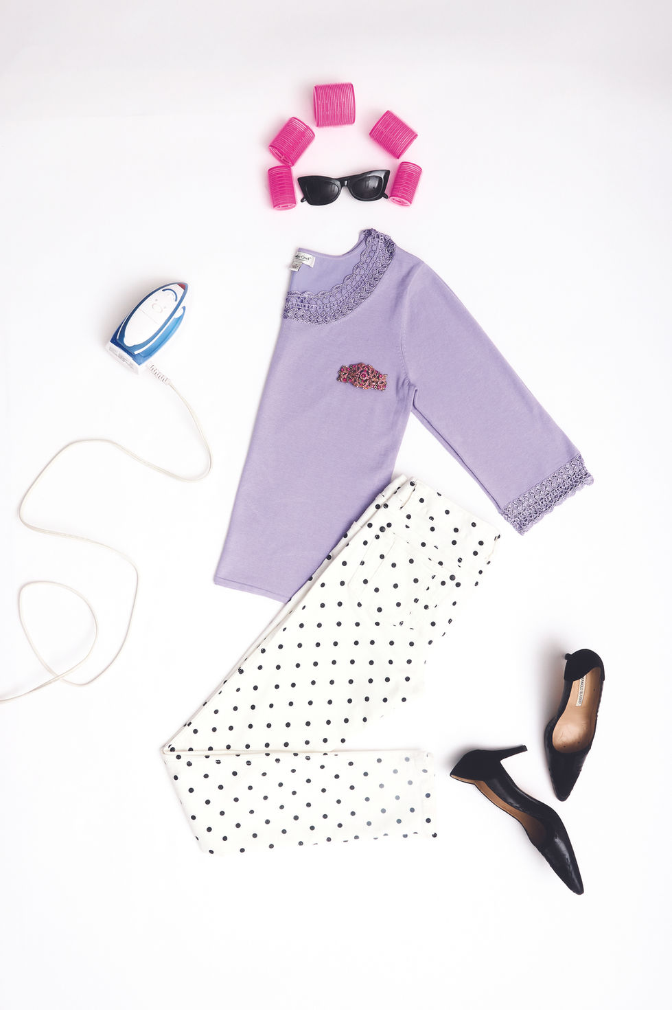Draw inspiration from the Real Housewife aesthetic of August Barron’s SS26 collection. The arrangement features items such as an iron and a vintage Vogue magazine, combined with bold colors and accessories. Folded sweaters and stacked pants are accompanied by tools, creating a blend of suburban calm and subversive edge. The result is a domestic ritual transformed into an avant-garde tableau.